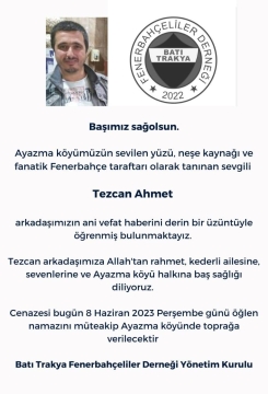 Herkes tarafından koyu bir Fenerbahçe taraftarı olarak bilinen Tezcan Ahmet için Batı Trakya Fenerbahçeliler Derneği tarafından taziye mesajı yayımlandı.