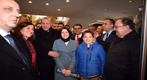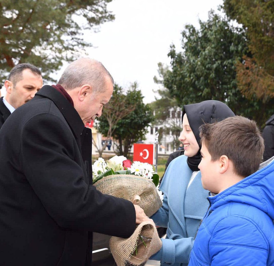 Cumhurbaşkanı kendisini çiçeklerle karşılayan, Elif Salih’e ve Yusuf Turan’a ilgi gösterdi.
