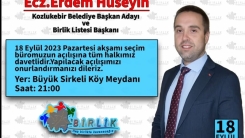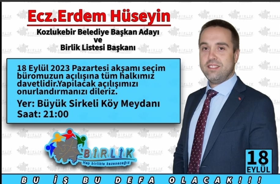 Kozlukebir Belediye Başkanlığına talip olan Erdem Hüseyin, liderliğini yaptığı Birlik Listesi'nin seçim merkezi bürosunu açılacağını duyurdu.