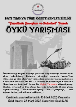 Batı Trakya Türk Öğretmenler Birliğinin (BTTÖB) organizatörlüğünde, “Çanakkale Savaşları ve Zaferleri” temalı bir öykü yarışması düzenlenecek. Yarışmanın, Çanakkale Savaşları’nın 111. yıl dönümü vesilesiyle ata yadigarı tarih bilincini yaşatmak ve öğrencilerin edebi yeteneklerini teşvik etmek amacıyla gerçekleştirileceği bildirildi.