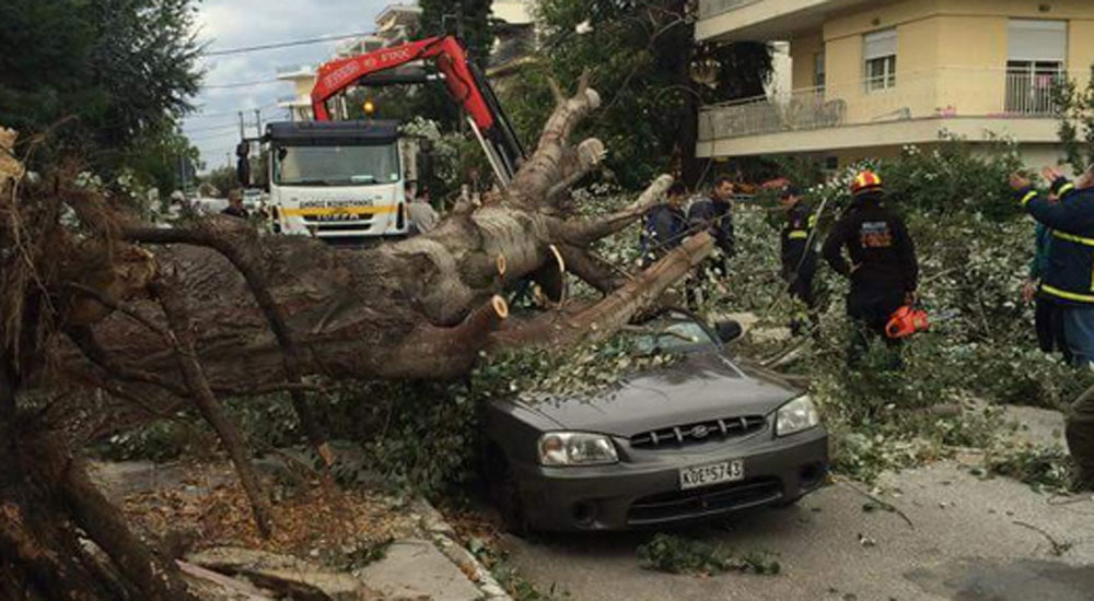 Gümülcine KTEL (Gümülcine Otogarı) bölgesinde Xristos Tsountas caddesinde Marinopoulos marketi yakınındaki dört yol yakınında bulunan iki dev ağaç esen sert rüzgara karşı dayanamayarak yola devrildi.