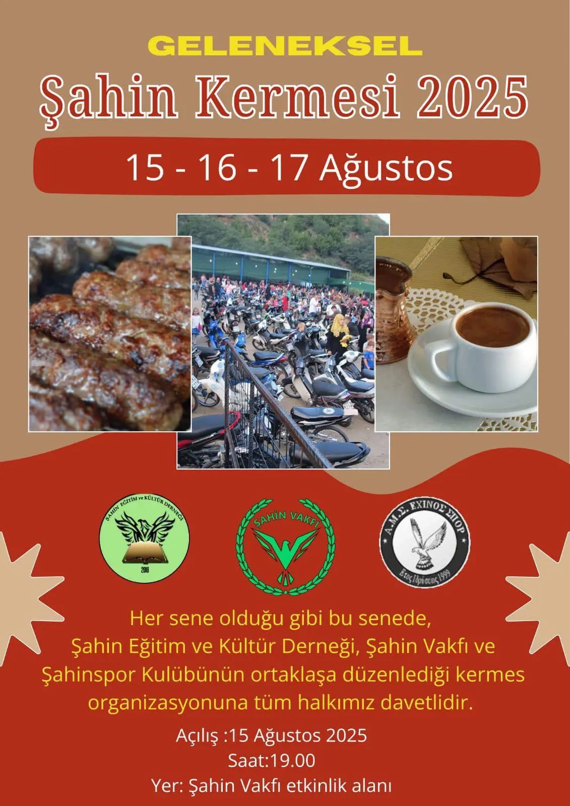 Her yıl geleneksel olarak düzenlenen Şahin Hayır kermesi bu yıl 15 Ağustos Cuma günü yapılan açılışla başladı. Kermes 16 Ağustos Cumartesi günü de devam edecek ve 17 Ağustos Pazar akşamı sona erecek.
