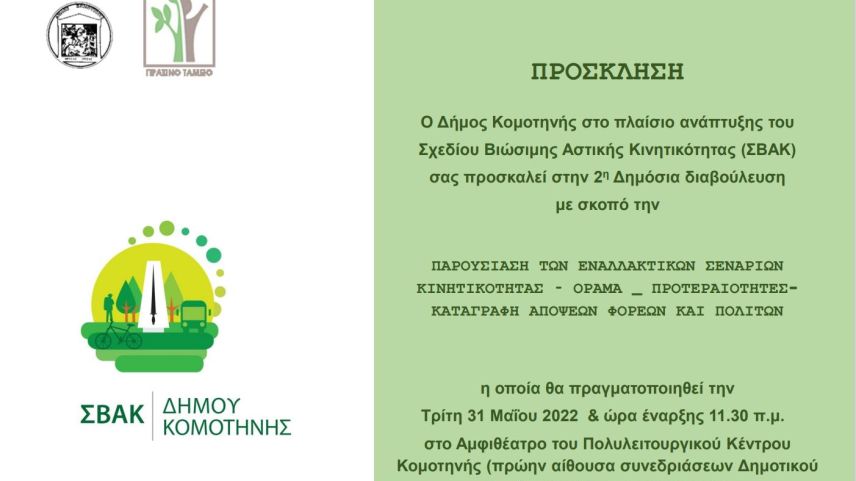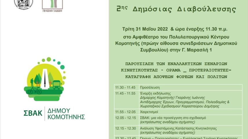 Gümülcine Belediyesi, gelecek on yıl için kensel hareketlilik konusunda şehirde ulaşımı kolaylaştırabilmek ve yaşam kalitelisini arttırabilmek amacıyla Sürdürülebilir Kentsel Hareketlilik Planının (SVAK) detaylandırılması ve alternatif senaryoların oluşturulması için istişare toplantısı düzenleyecek.