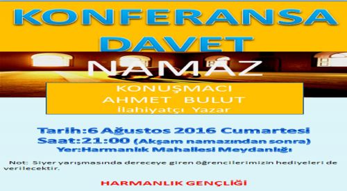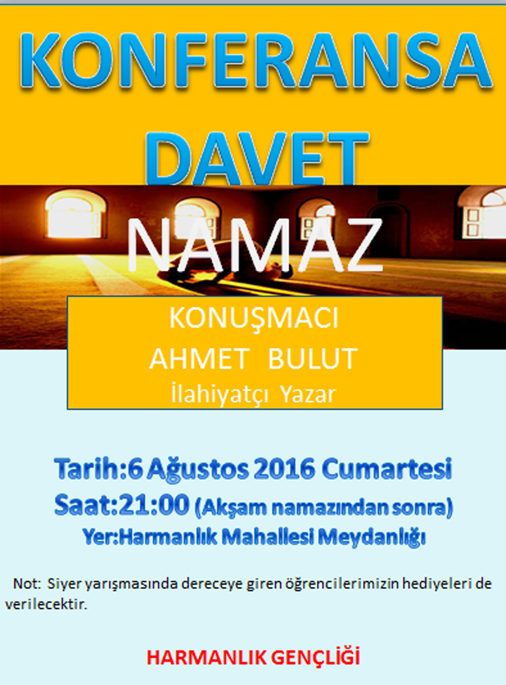 Harmanlık Gençliği’nin düzenleyeceği, Türkiye’den ilahiyatçı-yazar Ahmet Bulut’un konuşmacı olarak katılacağı “NAMAZ” konulu konferansa herkes davetlidir.