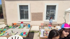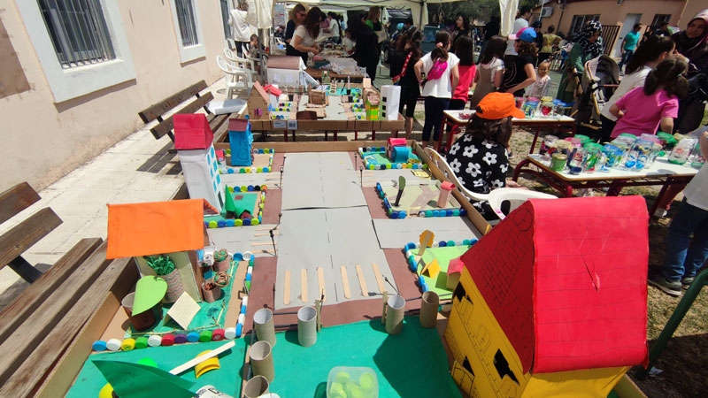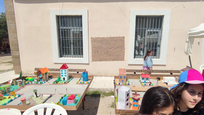 Ayrıca, geri dönüşüm atık malzemelerden çocukların tasarladığı şehir planı projesi sergilenmekte ve çocukların boyadığı cam şişeler satışa sunulmaktadır.