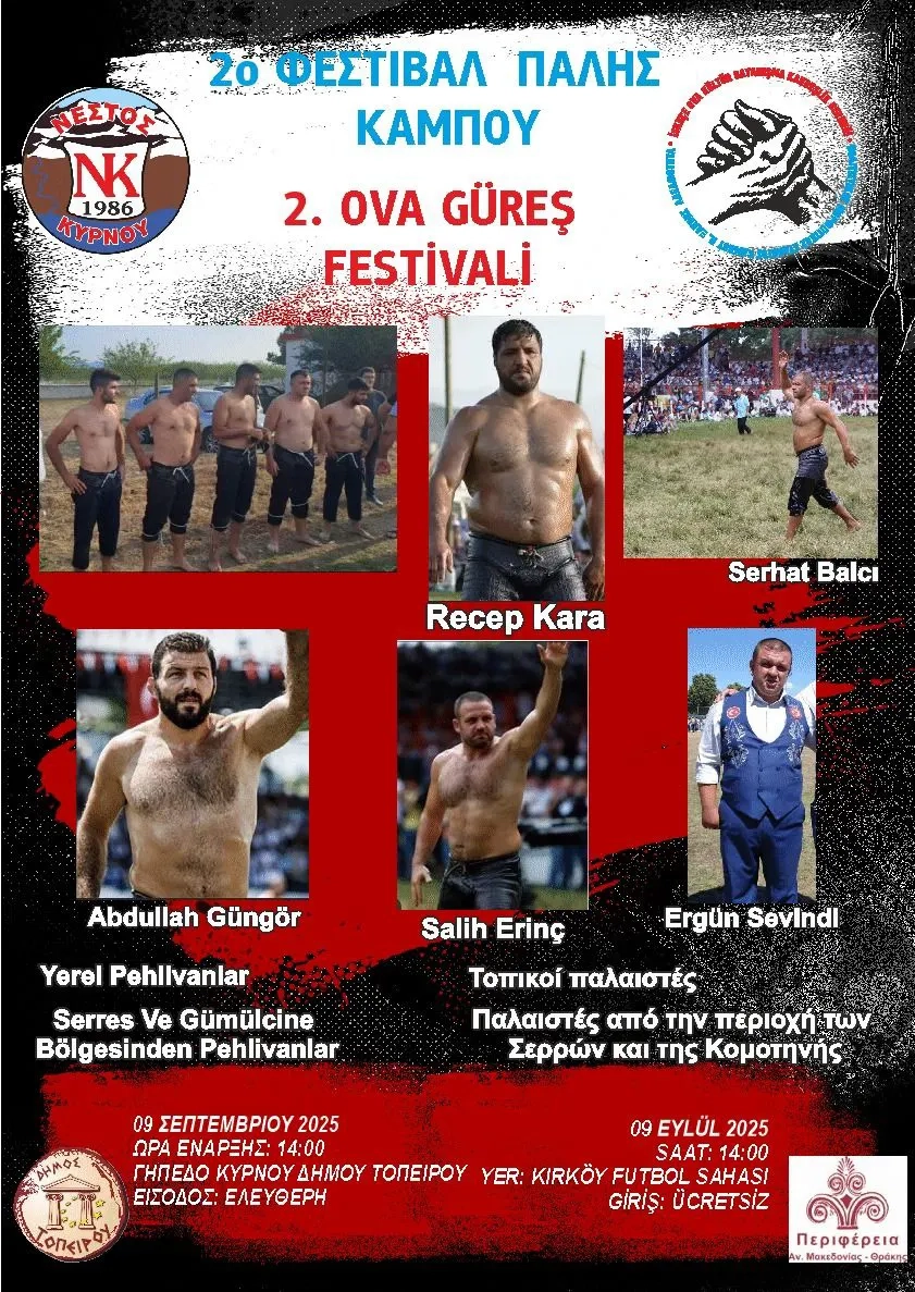 Organizasyona, Türkiye’den yağlı güreşin ünlü isimleri Recep Kara, Serhat Balcı, Abdullah Güngör ve Salih Erinç katılacağı belirtildi. Ayrıca Seres ve Gümülcine bölgesinden birçok pehlivan da er meydanına çıkarak hünerlerini sergileyecek.