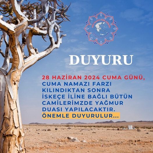 İskeçe Müftülüğü yarın 28 Haziran Cuma günü İskeçe’deki bütün camilerde yağmur duasının yapılacağını duyurdu.