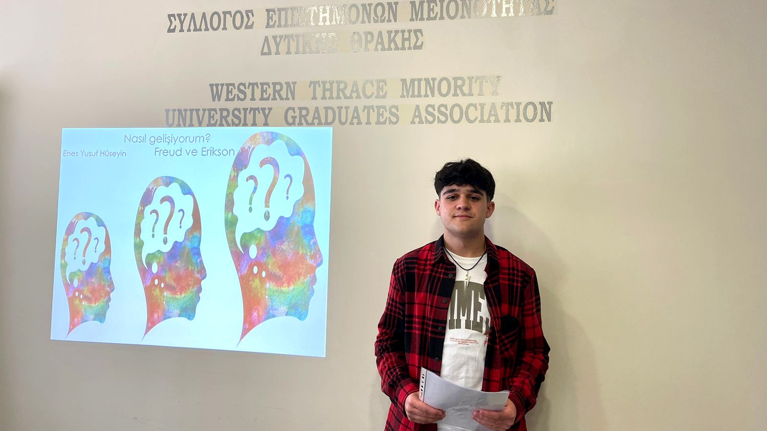 Oturumun ilk bölümünde lise son sınıf öğrencisi Enes, psikoloji tarihinin önemli isimleri olan Freud ve Erickson’un hayatı ve teorileri ile ilgili bir sunum gerçekleştirdi.