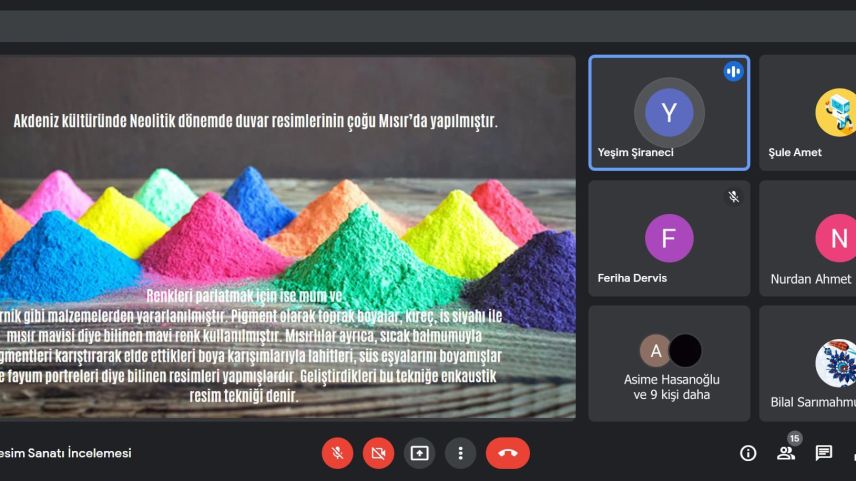 Sunumu yapan Lise 1. Sınıf öğrencileri Yeşim Şiraneci ve Şule Ahmet hazırladıkları çalışmada, “Mağara ve duvar resimleri, Mısır resim sanatı, Mezopotamya resim sanatı, Girit resim sanatı, Miken resim sanatı, Eski Yunan resim sanatı, Etrüsk resim sanatı, Roma resim sanatı” hakkında bilgi verdiler.