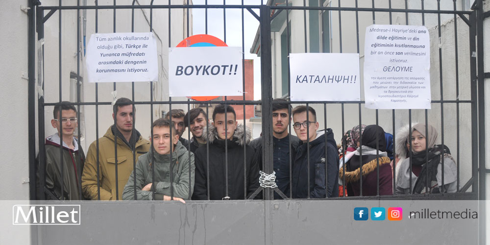 Gümülcine Medrese-i Hayriye okulu öğrencileri, Yunan devletinin Türkçe ve din derslerini azaltma kararında geri adım atmaması nedeni ile demokratik haklarını kullanarak ikinci kez boykot kararı alarak okulun kapısına bu kez süresiz kilit vurdu.