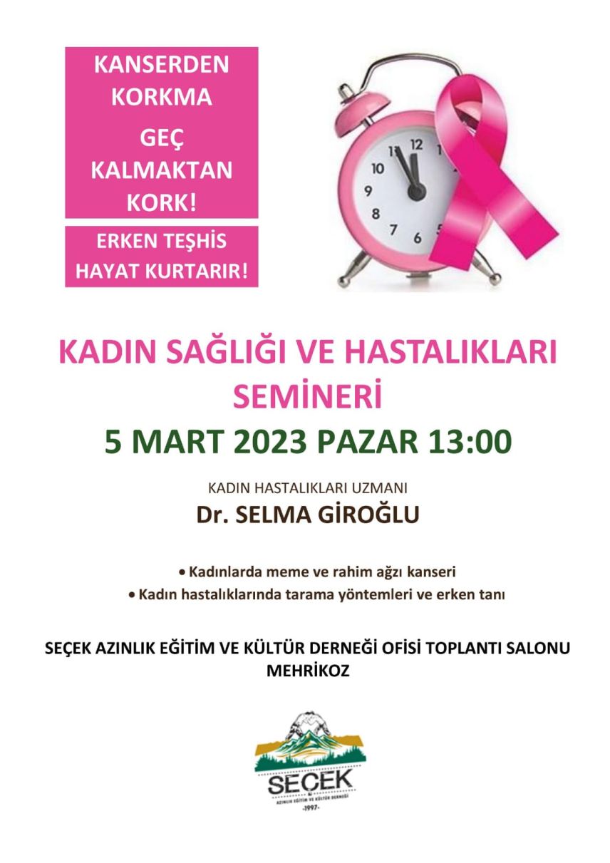 Seçek Azınlık Eğitim ve Kültür Derneği tarafından düzenlenecek, Dr. Selma Giroğlu'nun konuşma yapacağı seminerde "Kadınlarda Meme ve Rahim Ağzı Kanseri" ile "Kadın Hastalıklarında Tarama Yöntemleri ve Erken Tanı" konularında Mehrikoz kadınları bilgilendirilecek, merak edilenler sorulacak.