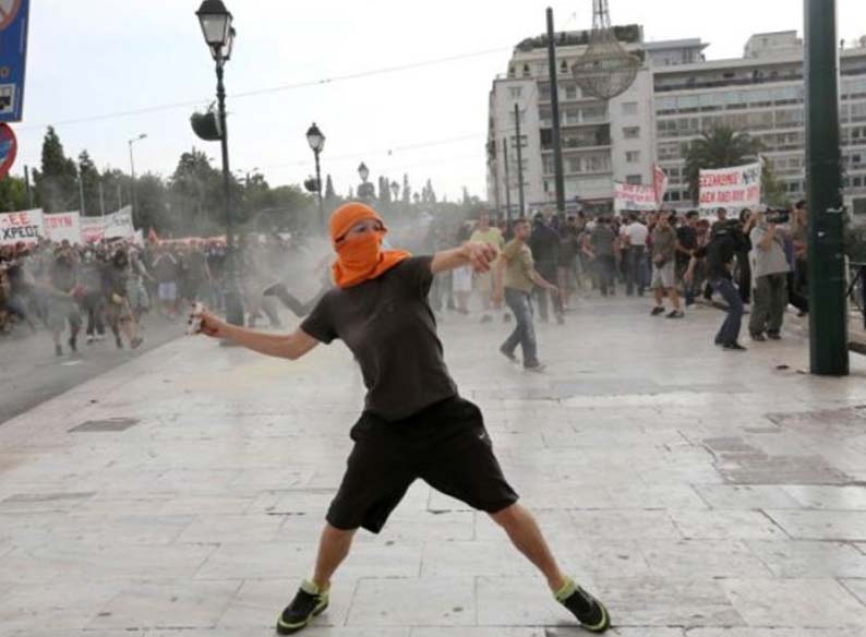 Sabah saatlerinden itibaren parlamento ve hükümet binalarının bulunduğu Sintagma meydanında toplanan bazı göstericilerin, taş ve su şişeleriyle polislere saldırması üzerine arbede çıktı.