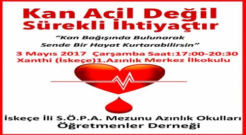 İskeçe İli S.Ö.P.A. Mezunu Azınlık Okulları Öğretmenler Derneği 3 Mayıs 2017 Çarşamba günü Saat:17:00-20:30 arası Xanthi (İskeçe) 1. Azınlık Merkez İlkokulunda ihtiyaç sahiplerinin kan ihtiyacını karşılamak ve öğrencilerimize örnek olmak adına Kan Bağışı Kampanyası düzenliyoruz.