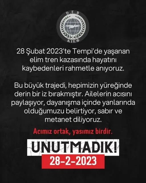 28 Şubat 2023'te meydana gelen ve 57 kişinin hayatını kaybettiği Tempi tren faciası nedeniyle DEB Partisi tarafından yapılan açıklama şöyle:
