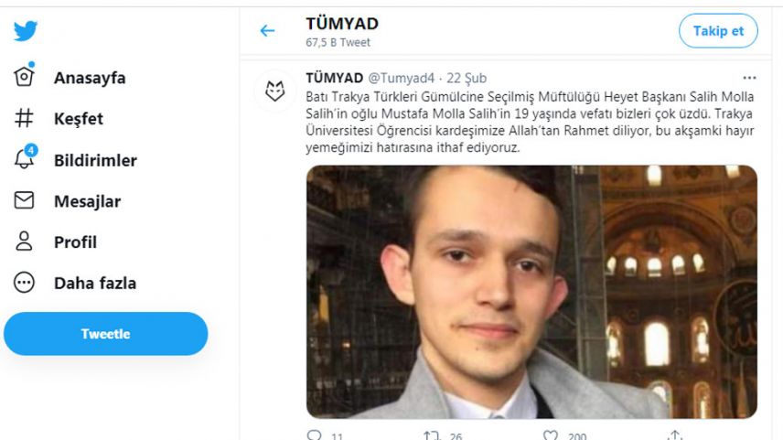 “Batı Trakya Türkleri Gümülcine Seçilmiş Müftülüğü Heyet Başkanı Salih Molla Salih’in oğlu Mustafa Molla Salih’in 19 yaşında vefatı bizleri çok üzdü. Trakya Üniversitesi Öğrencisi kardeşimize Allah’tan Rahmet diliyor, bu akşamki hayır yemeğimizi hatırasına ithaf ediyoruz.”