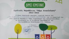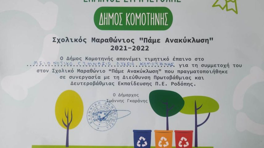 Followgreen programına katılarak geri dönüşüm için yarışan çevrenin, doğanın korunmasına ve israfın önlenmesine katkı sağlayarak dereceye giren Celal Bayar Azınlık Lisesi Ortaokul ve Lisesi'nin orta 2 öğrencilerini Gümülcine Belediye Başkanı Yannis Garanis tebrik etti, onlara takdir belgesi verdi.