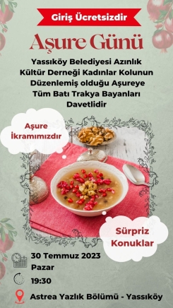 Yassıköy Belediyesi Azınlık Kültür Derneği'nin çatısı altında faaliyet gösteren Kadınlar Kolu, 30 Haziran 2023 Pazar günü Aşure Günü etkinliği düzenleyecek.