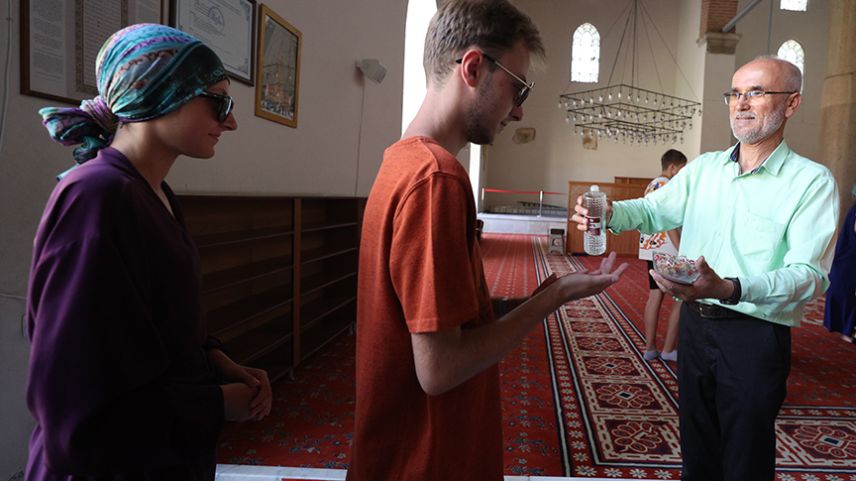 İmam, şeker ikramıyla karşıladığı konuklarını 25 farklı dildeki sohbetiyle ağırlıyor, abdest almayı öğrettikten sonra uğurluyor.