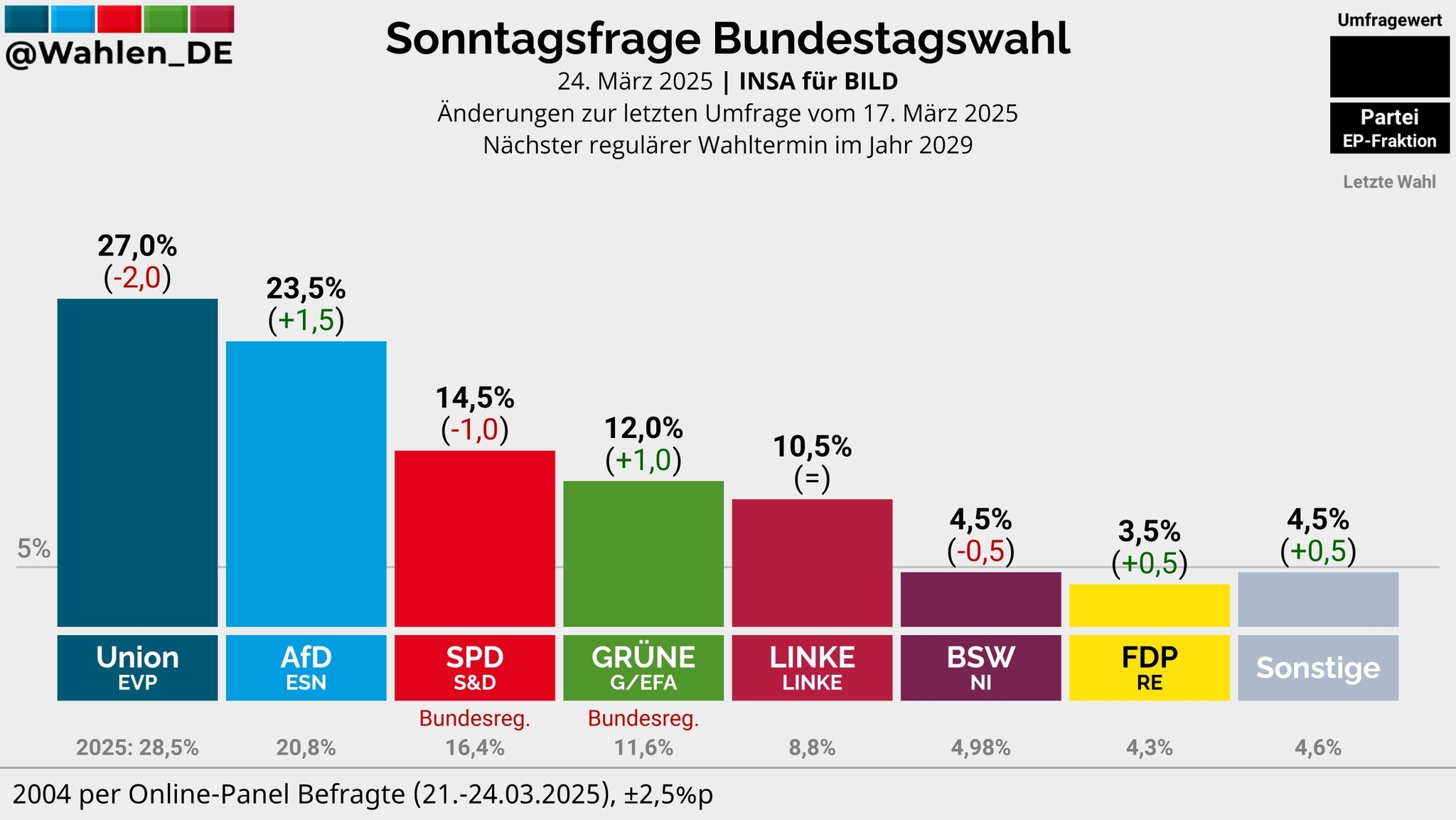 Anket sonuçlarına göre Hristiyan Birlik Partileri (CDU/CSU) toplamda %27 oy oranıyla ilk sırada yer aldı. AfD ise %23,5 ile ikinci sıraya yerleşti. Sosyal Demokrat Parti (SPD) %14,5, Yeşiller %12, Sol Parti ise %10,5 oranında oy aldı.