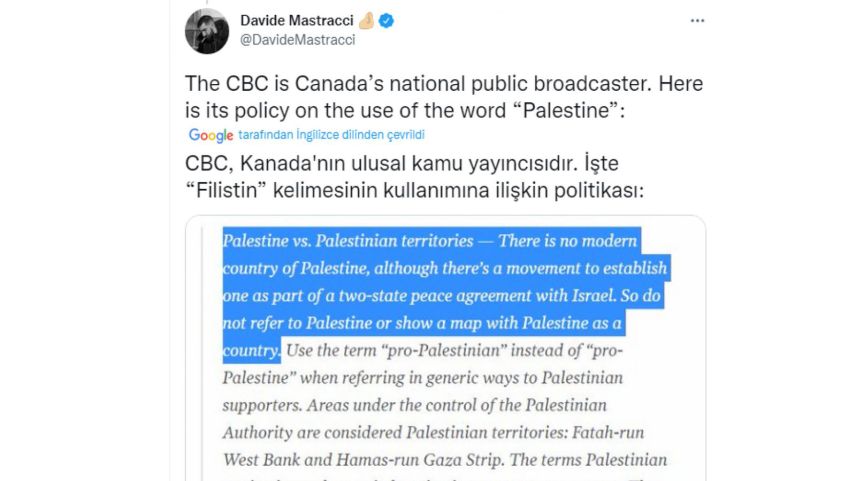 İngiltere'nin en önde gelen ulusal medya kuruluşu BBC'nin ise çalışanlara, "Gazze ya da Batı Şeria'dan bahsederken Filistin dememelisiniz. O tarihi bir varlık" şeklinde talimat verdiği belirlendi.