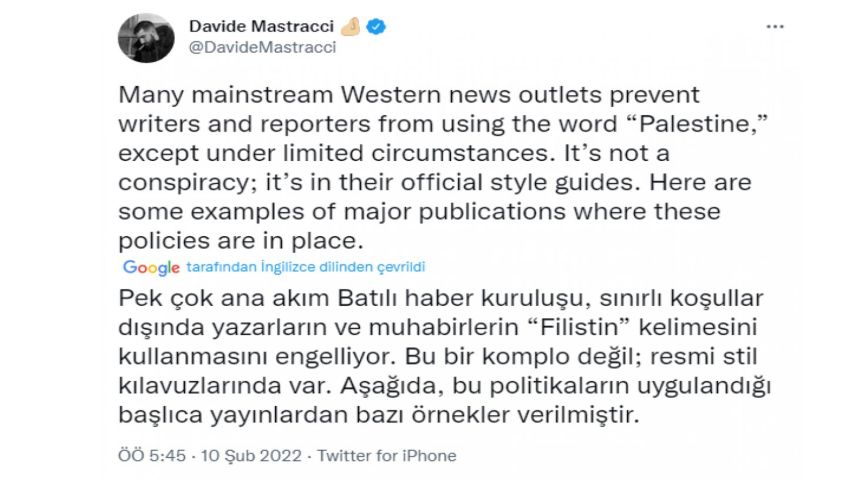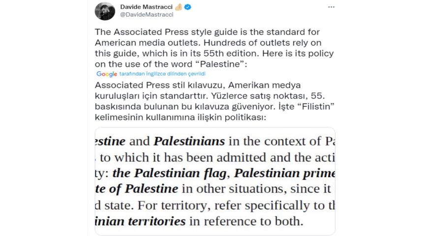 Kanadalı gazateci Davide Mastraci'nin yaptığı araştırmaya göre Amerika'nın önde gelen medya kuruluşlarından Assocaited Press, kurum politikası klavuzunda "Filistin" kelimesinin kullanımına ilişkin çalışanlarına katı talimatlar verdi.