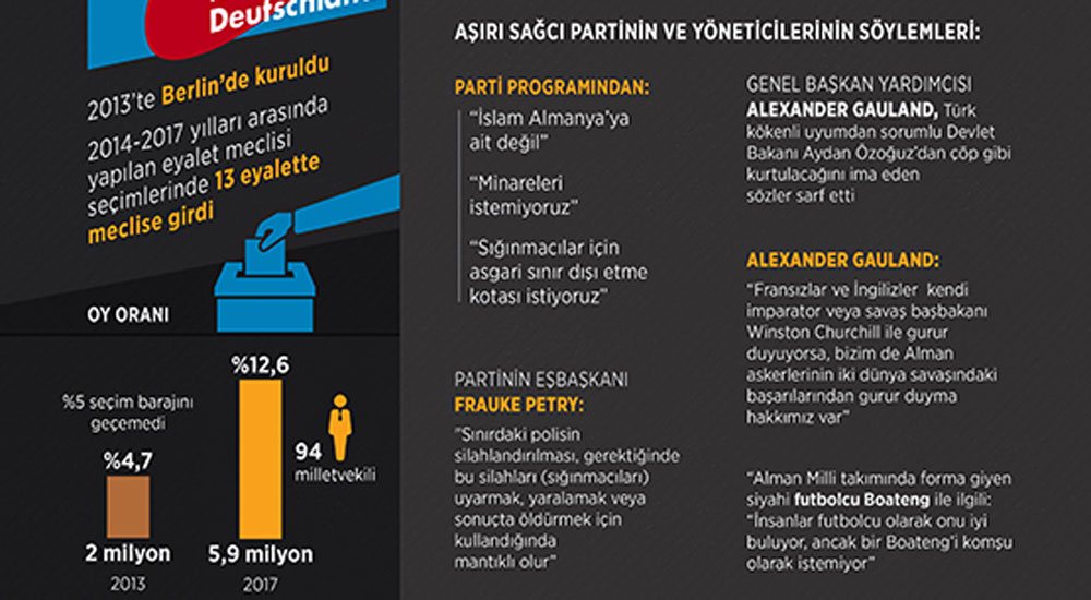 Almanya’da İslam karşıtı, aşırı sağcı Almanya için Alternatif (AfD) partisi, genel seçimlerde önemli sayıda milletvekili çıkarıp Federal Meclis’e girerek yükselişini sürdürdü.
