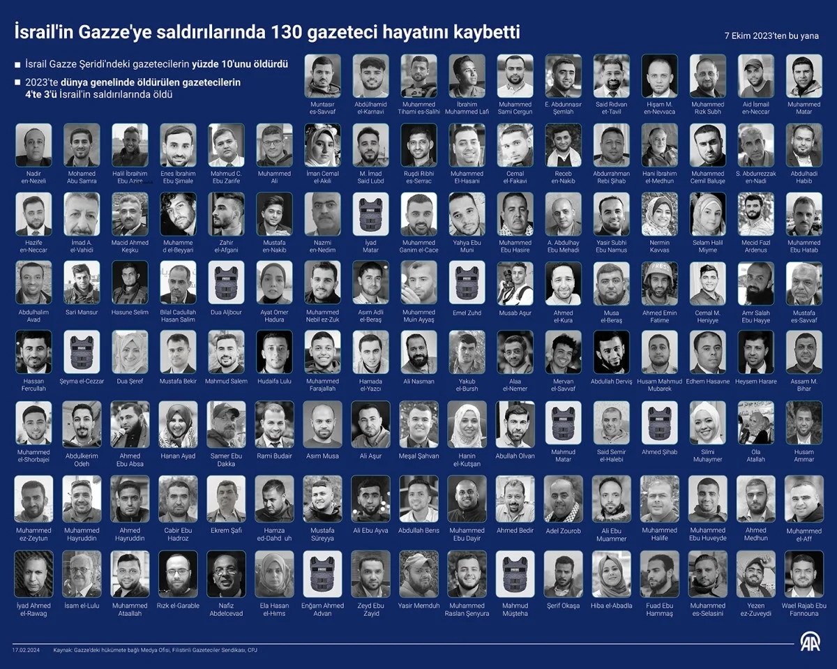 İsrail'in 7 Ekim 2023'ten bu yana Gazze'ye düzenlediği saldırılarda öldürülen gazetecilerin sayısının 130'a çıktığı kaydedildi.