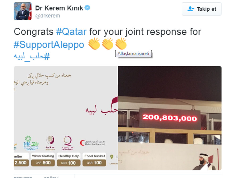 Kızılay Başkanı Kerem Kınık, söz konusu yardım için sosyal medya hesabı üzerinden Katar'a tebrik mesajı gönderdi. Kınık, Twitter hesabından şu ifadeleri kullandı: "Halep'e desteğe ortak yanıtın için tebrikler Katar."