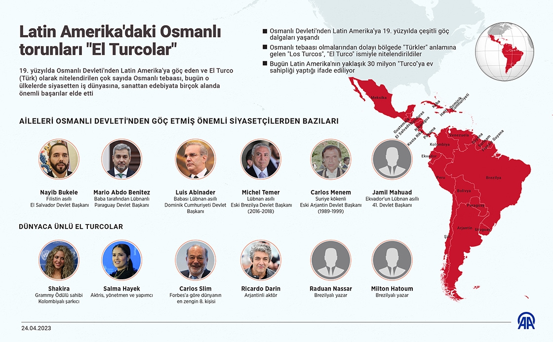 19. yüzyılda daha iyi bir yaşam arayışıyla Osmanlı Devleti'nden Latin Amerika'ya göç eden ve El Turco (Türk) olarak nitelendirilen çok sayıda Osmanlı, bugün o ülkelerde siyasetten iş dünyasına, sanattan edebiyata birçok alanda önemli başarılar elde etti.