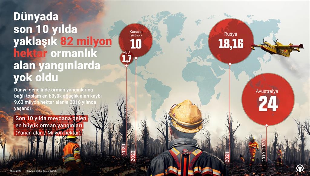 Dünyanın dört bir yanında son 10 yılda yaklaşık 82 milyon hektarlık ormanlık alan yangınlarda yok olurken, en büyük felaketler Avustralya, Rusya, Kanada ve ABD'de yaşandı.