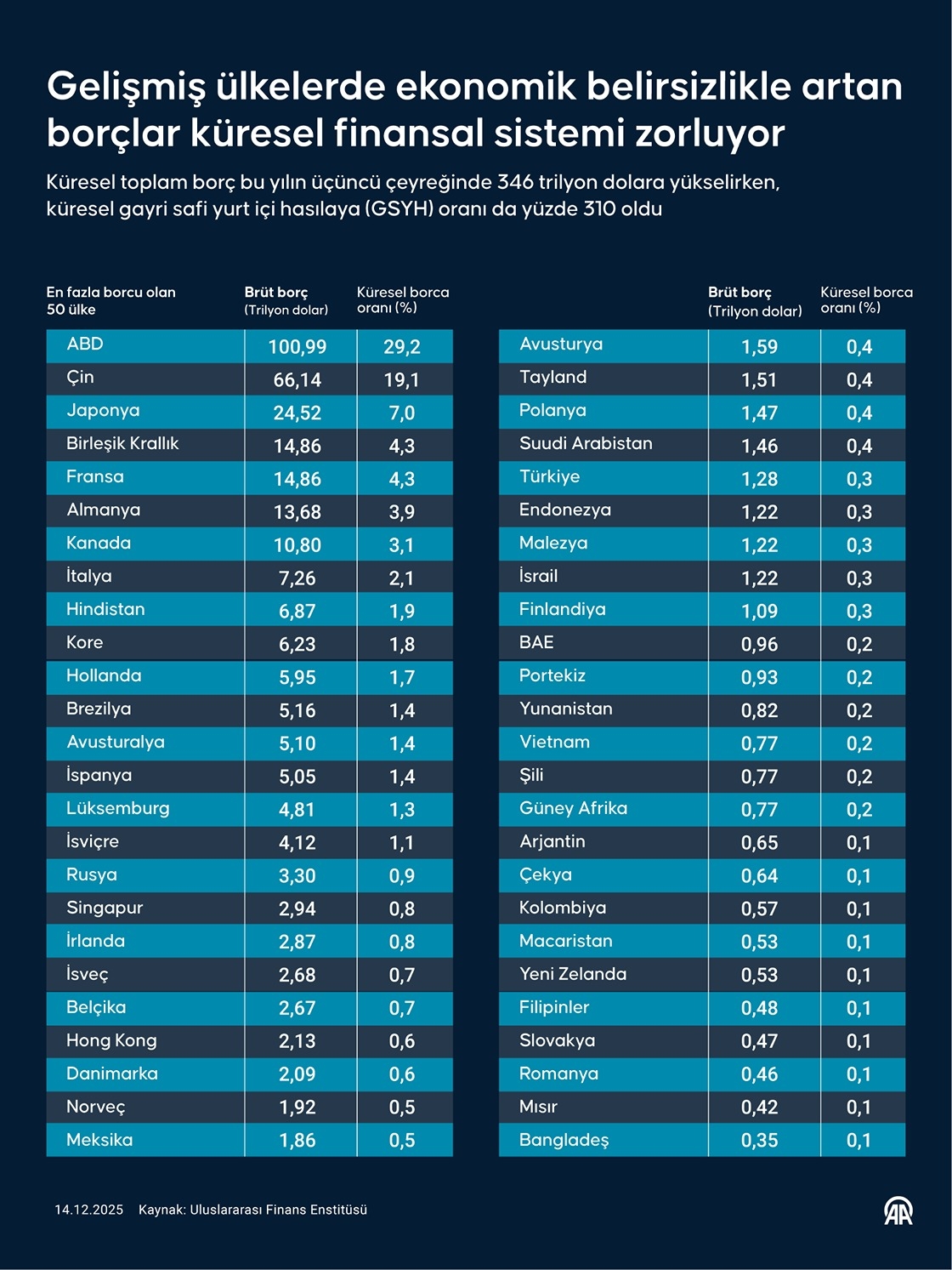 Küresel ekonomi, Kovid-19 salgını ve Rusya-Ukrayna Savaşı'ndan ABD'nin gümrük vergileri konusundaki politika değişikliklerine kadar birçok ekonomik şokla karşı karşıya kalırken, bununla gelen belirsizlik ve yükselen faizlerle gelişmiş ülkelerin borçlarının artması dikkati çekiyor.