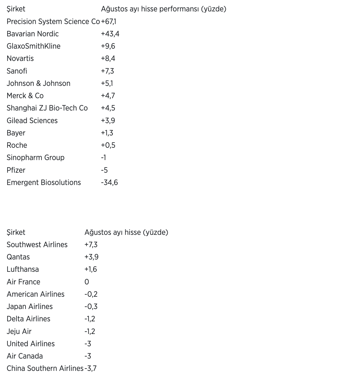 Dünyanın önde gelen ilaç, tıbbi teknoloji ve biyofarmasötik ve hava yolu şirketlerinin ağustos ayı hisse performansları şöyle: