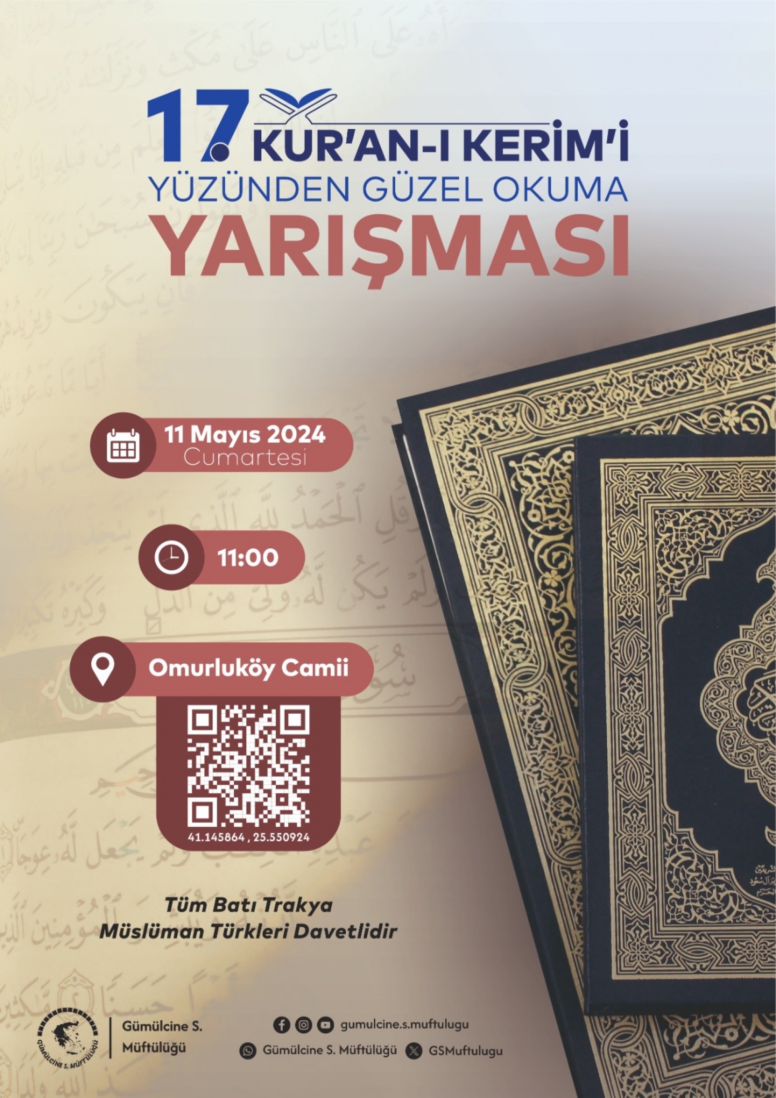 Gümülcine Müftülüğü, bu yıl 17’incisi düzenlenecek olan “Kur’an-ı Kerim’i Güzel Okuma Yarışması”nın Omurluköy’de gerçekleşeceğini açıkladı.