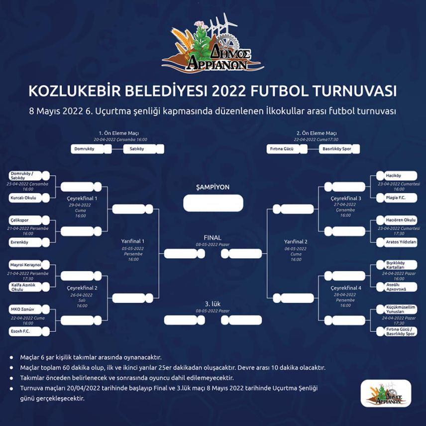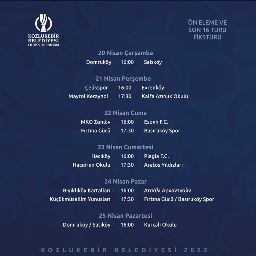 Kozlukebir Belediyesi Futbol Turnuvası 2022 maç programı 20 Nisan 2022 Çarşamba günü Domruköy ile Satıköy ilkokul öğrencileri tarafından oluşturulan takımlar arasında oynanan 1. Ön Eleme Maçı ile başladı.