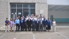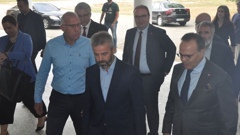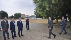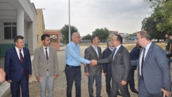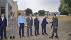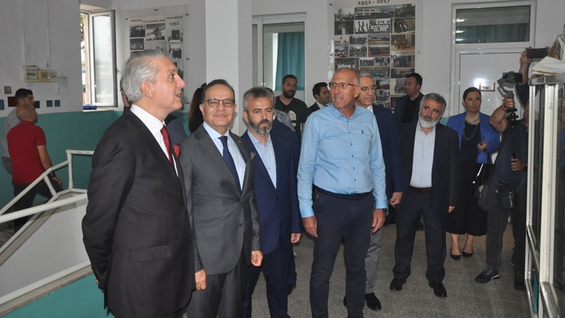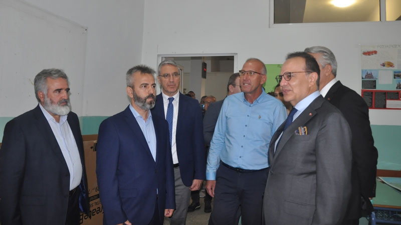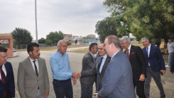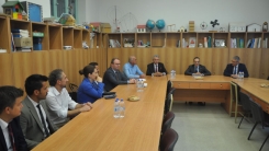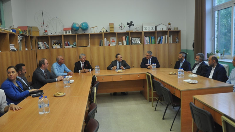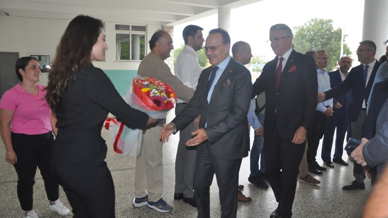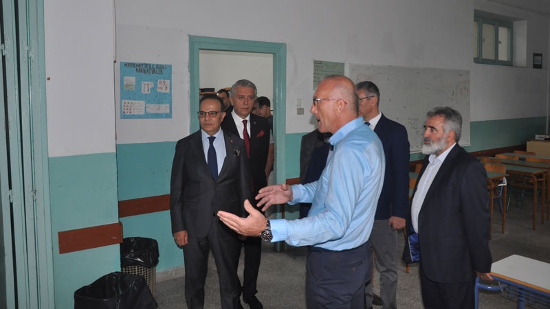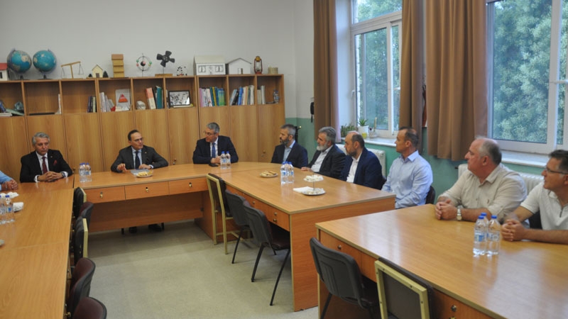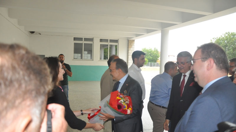 Bakan yardımcısı ve beraberindeki heyet, okul bahçesinde Encümen Heyeti, okul müdürü ve öğretmenler tarafından karşılandı.