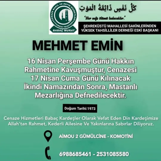 Geçirdiği kalp krizi sonucu hayatını kaybeden eski BTAYTD Başkanı Mehmet Emin'in cenazi 17 Nisan Cuma günü kılınacak ikindi namazının ardından Gümülcine’deki Mastanlı Mezarlığında toprağa verilecek.