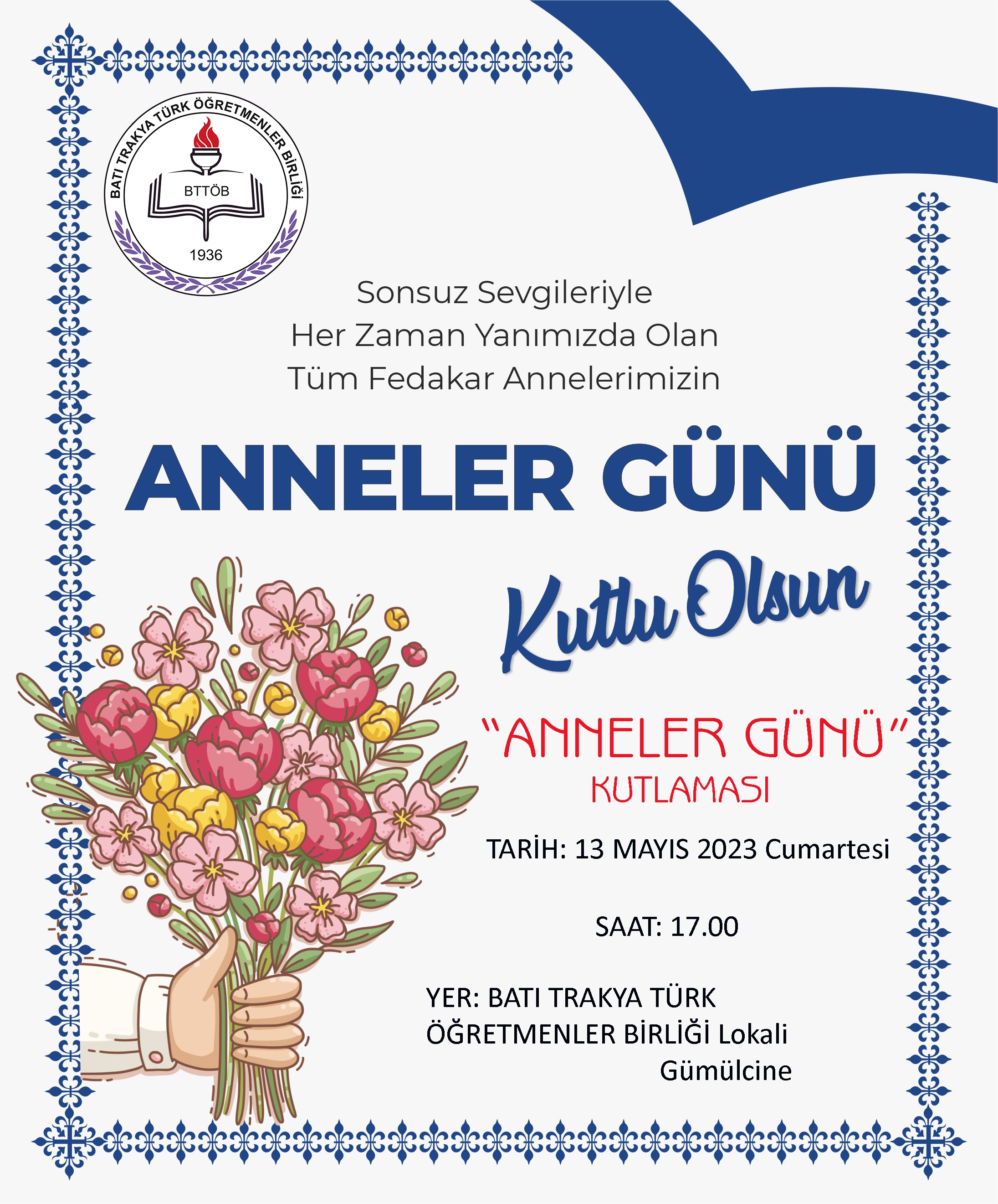 Batı Trakya Türk Öğretmenler Birliği (BTTÖB), 13 Mayıs Cumartesi günü "Anneler Günü Kutlaması" etkinliği düzenleyecek.