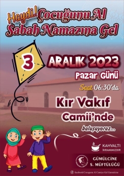 3 Aralık 2023 Pazar günü Kır Vakıf Camii'nde düzenlenecek "Çocuğunu Al Sabah Namazına Gel" programı saat 06.30'da başlayacak.
