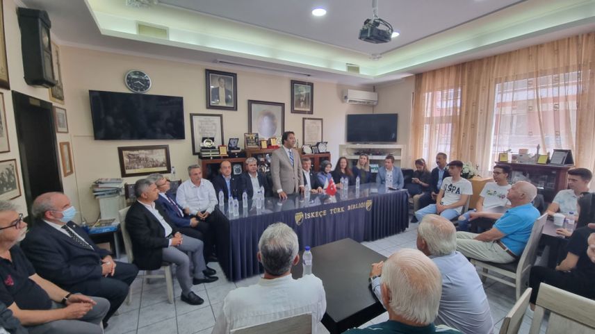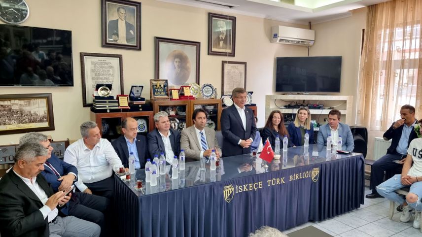 Davutoğlu ve beraberindeki heyet İskeçe Türk Birliği girişinde Başkan Ozan Ahmetoğlu ve Yönetim Kurulu Üyeleri tarafından karşılandı. İskeçe Türk Birliği girişinde yıllardır yerinde olmayan tabelanın bir gün mutlaka yerine asılacağını ifade eden Davutoğlu girişte Yönetim Kurulu üyeleriyle hatıra fotoğrafı çektirdi. Davutoğlu ve beraberindekiler daha sonra İskeçe Türk Birliği salonuna geçtiler. Burada ilk önce İskeçe Türk Birliği Başkanı Ozan Ahmetoğlu söz alarak İskeçe Türk Birliği’nin verdiği mücadeleyi ve son yaşanan gelişmeleri özetleyen bir konuşma yaptı. İskeçe Türk Birliği’nin Batı Trakya Türklerinin sembol kurumlarından biri olduğunu belirten Ahmetoğlu bu mücadelenin kararlılıkla devam edeceğinin altını çizdi.