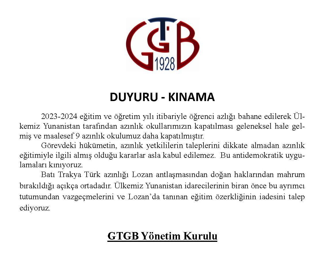 Gümülcine Türk Gençler Birliği Yönetim Kurulu, Eğitim Bakanlığı tarafından "çocuk azlığı" gerekçesi ile 9 azınlık ilkokulun daha kapatılmasını kınadı.