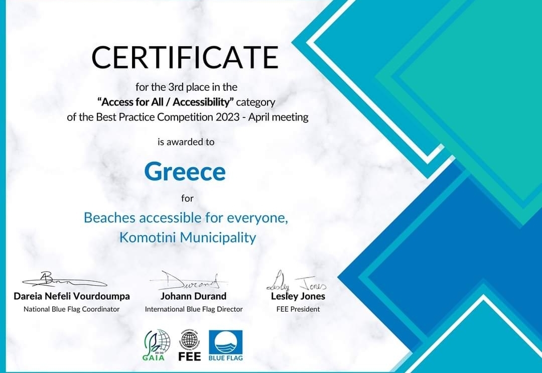 Gümülcine Belediyesi FEE (Ekonomik Eğitim Vakfı) uluslararası yarışmasında "Herkes için plajlara erişilebilirlik" tematik bölümünde 3'ncülük ödülü aldı.