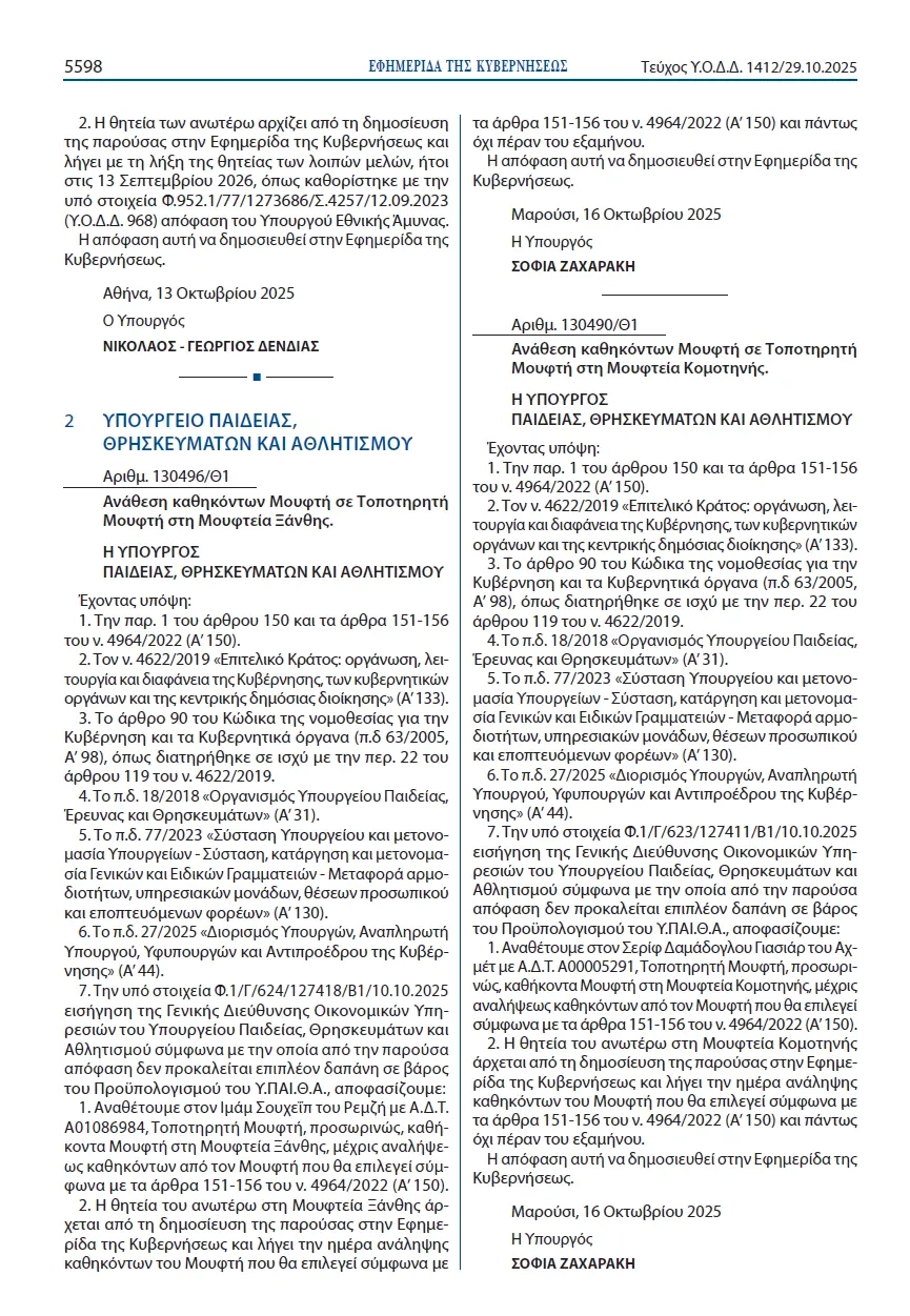 Eğitim ve Din İşleri Bakanı Sofia Zaharaki’nin imzasını taşıyan karar, 29 Ekim 2025 tarihli Resmî Gazete’de (Υ.Ο.Δ.Δ. 1412/2025) yayımlandı.