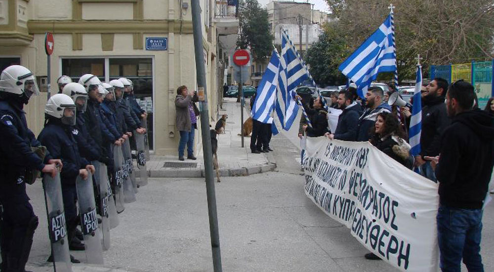 Gümülcine’de üniversite eğitimi gören Kıbrıslı Rum öğrenciler, Kuzey Kıbrıs Türk Cumhuriyeti’nin 33. kuruluş yıldönümünü protesto etmek için her yıl olduğu gibi