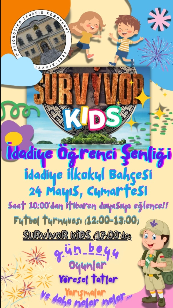 Gümülcine 1. Türk Azınlık İlkokulu (İdadiye) tarafından organize edilen Öğrenci Şenliği, 24 Mayıs 2025 Cumartesi günü okulun bahçesinde gerçekleştirilecek.