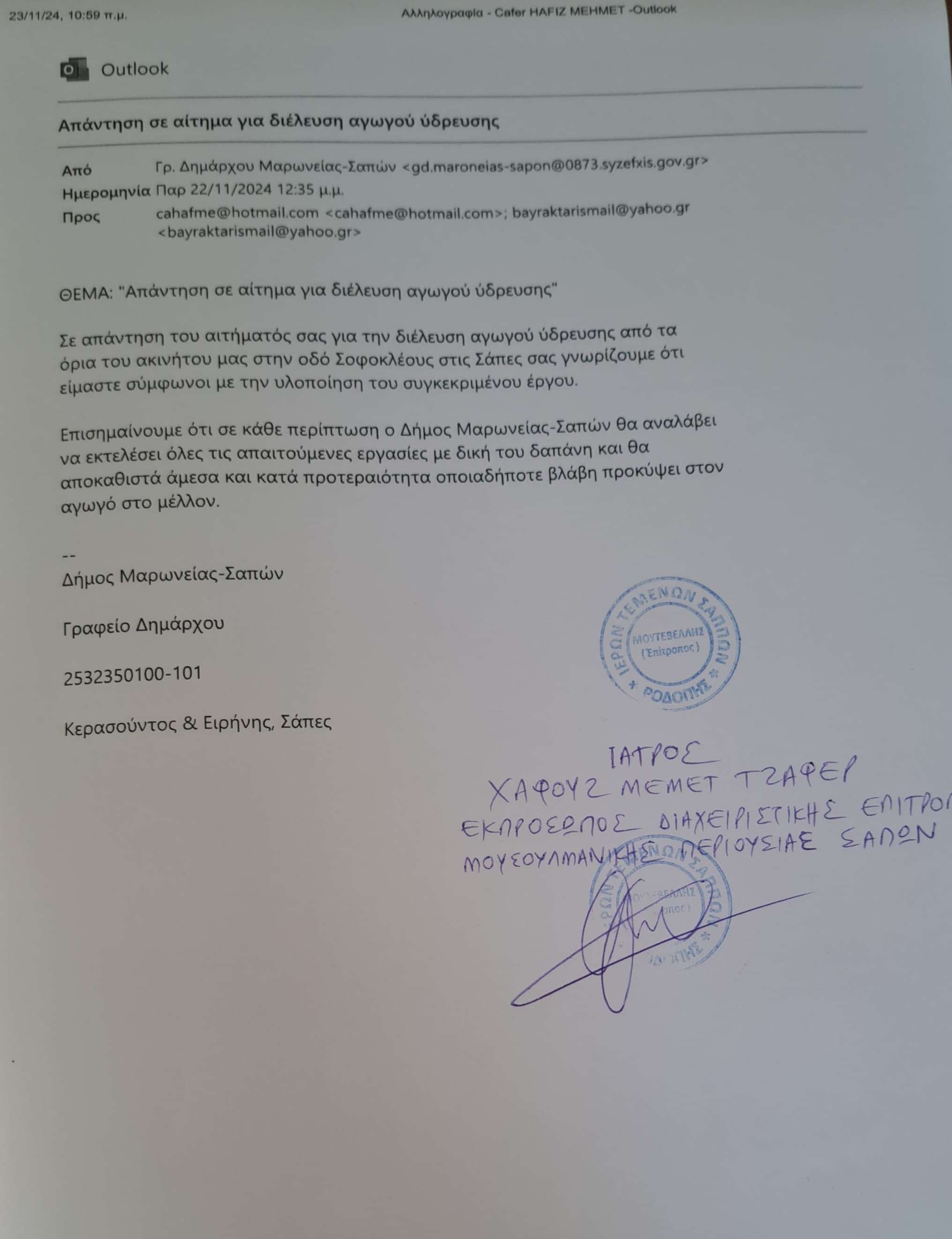 Maronya Belediyesi muhalefet listesi başkanı Dinos Haritopulos, yaptığı açıklamada belediye yönetiminin futbol sahası için su şebekesini Müslüman (Türk) mezarlığının içinden geçirme kararına tepki göstererek, Şapçı Mütevelli Heyeti’nin bu durumdan haberdar olup olmadığını sormuştu. Konuya ilişkin olarak Şapçı Mütevelli Heyeti'nden bir açıklama geldi.