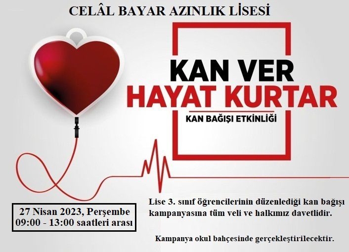 Kan bağışı kampanyası, 27 Nisan 2023 Perşembe günü, saat 09.00 ile 13.00 arasında Celal Bayar Azınlık Ortaokulu ve Lisesi bahçesinde düzenlenecek.