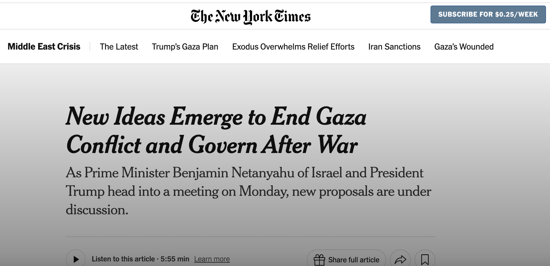 Temmuz 2025’e gelindiğinde, artan küresel baskılar ve sosyal medya tepkileri sonucunda Batı medyasında kısmi bir değişim gözlendi. NBC ve CNN, Gazze’den “açlıktan ölen çocuklar” görüntülerine yer verirken, NYT köşe yazarı Ross Douthat savaşın artık “adaletsiz” bir hal aldığını kaleme aldı.