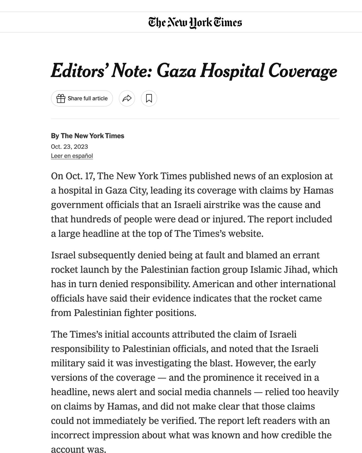 New York Times (NYT) ve Washington Post (WP) gibi büyük medya kuruluşlarının ise saldırıların ilk haftalarında İsrail'e dair eleştirel ifadeleri sansürlediği ortaya çıktı.