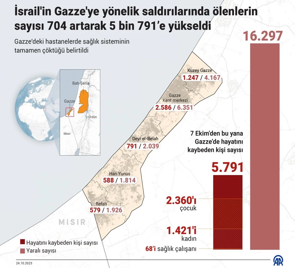 Deyr el-Belah bölgesinde 791 kişi öldü, 2 bin 39 kişi yaralandı. Gazze kent merkezinde 2 bin 586 kişi öldü, 6 bin 351 kişi yaralandı. Kuzey Gazze’de ise bin 247 kişi öldü, 4 bin 167 kişi yaralandı.
