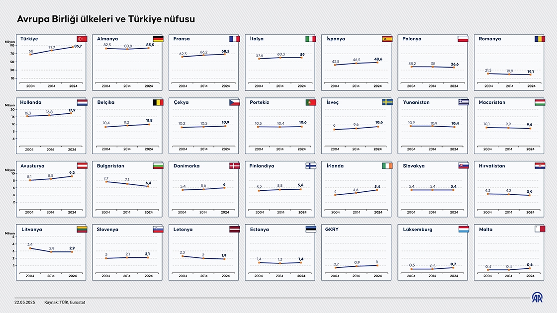 Avrupa’da nüfus dengeleri değişiyor: Yunanistan’ın nüfusu azalırken Türkiye yükselişte, Almanya ise AB’nin en kalabalık ülkesi olmaya devam ediyor.
